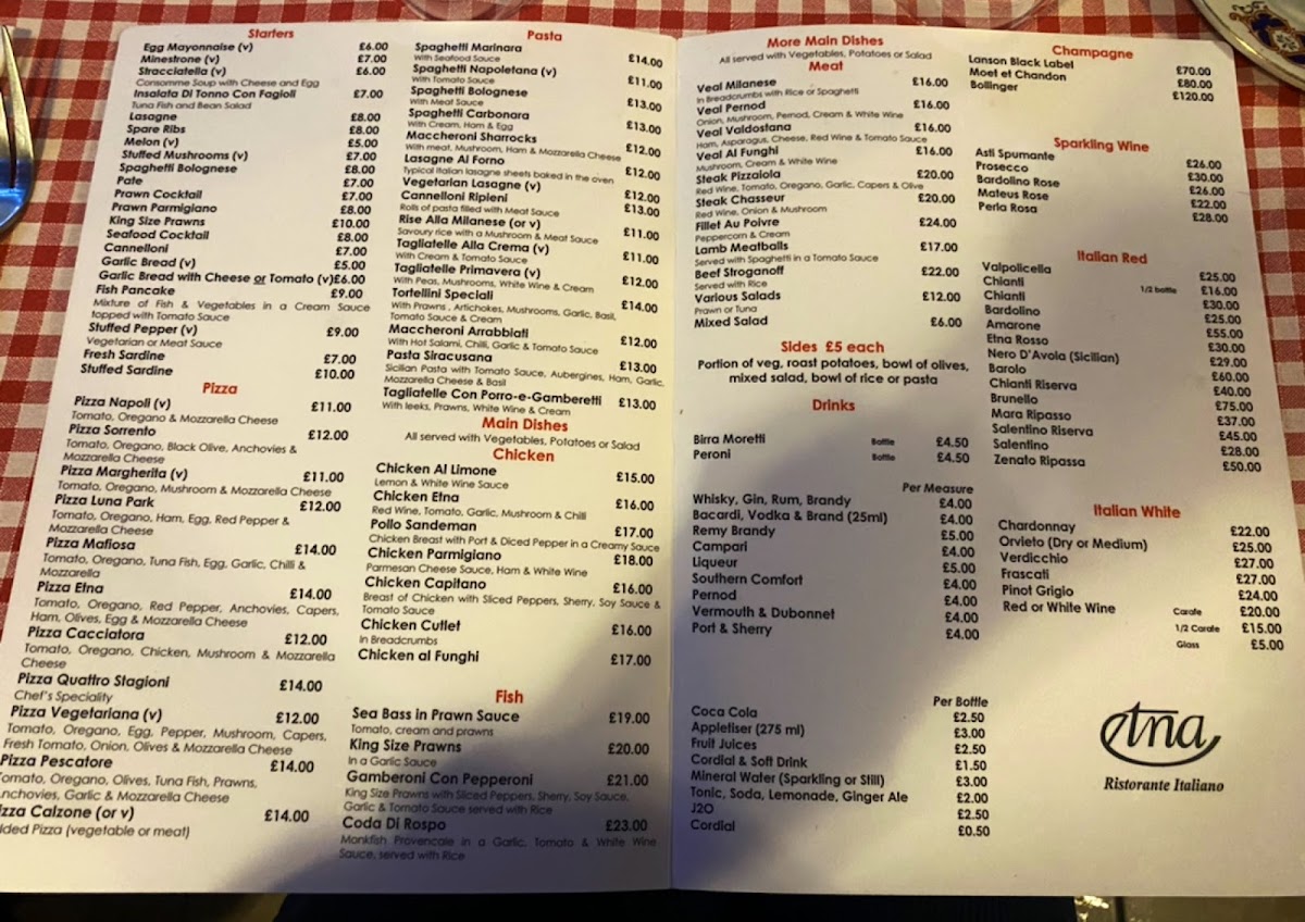Welcome to Etna - 22 New St, a charming gem nestled in Lancaster that transports you to the heart of Sicily with its delightful menu. This family-run establishment offers an authentic taste of Italian cuisine, showcasing a variety of mouth-watering pizzas such as the classic Pizza Margherita and the bold Pizza Sorrento. Each dish, from the Sea Bass in Prawn Sauce to the tender Veal Milanese, is crafted with care and boasts fresh ingredients, ensuring a memorable dining experience.